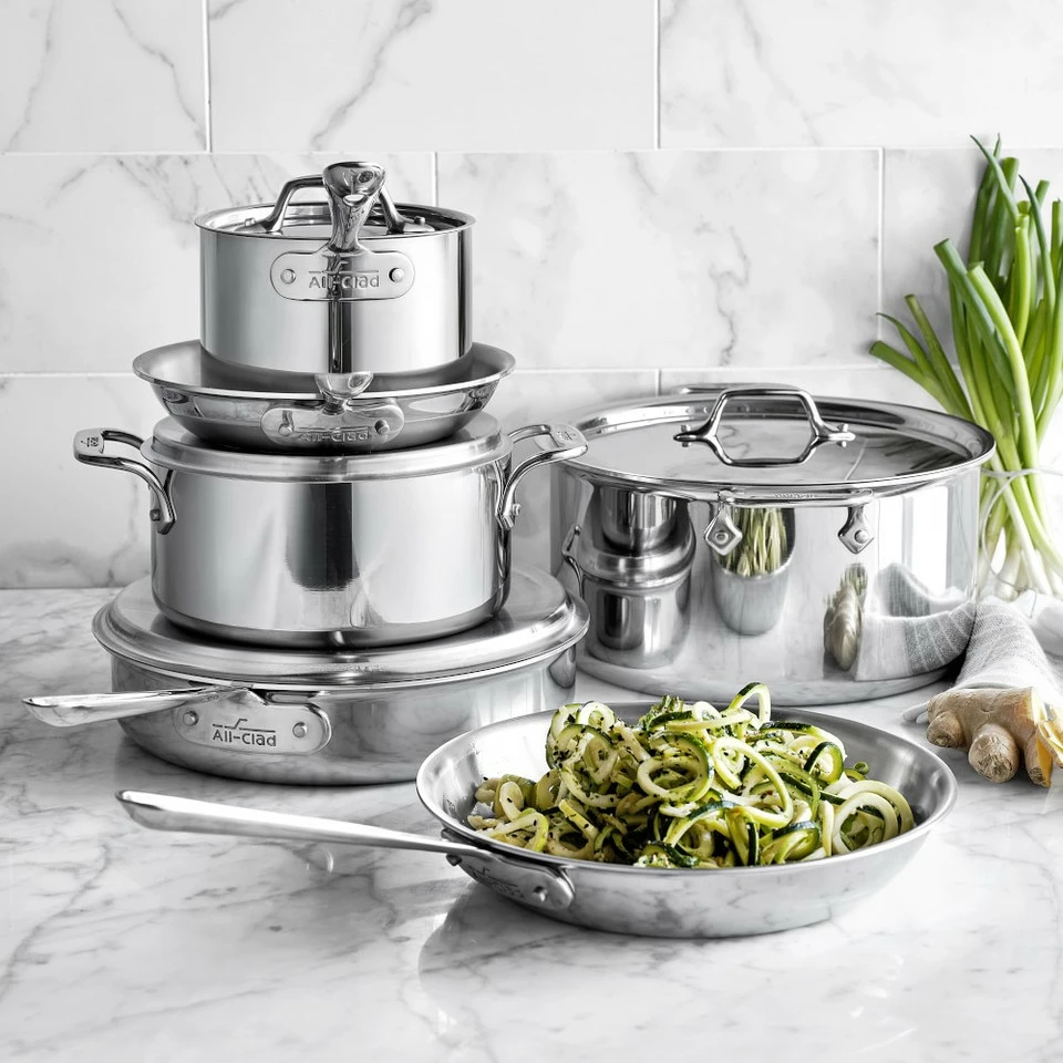 Ideally suited for cooks of all skill levels, All-Clad’s Tri-Ply Stainless-Steel cookware line pairs classic style with modern practicality. A capacity engraving on each pan’s base makes picking the right size a snap, and an improved ergonomic handle ensures comfort. This set includes all the essential pots and pans needed to perform a variety of cooking techniques.