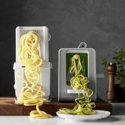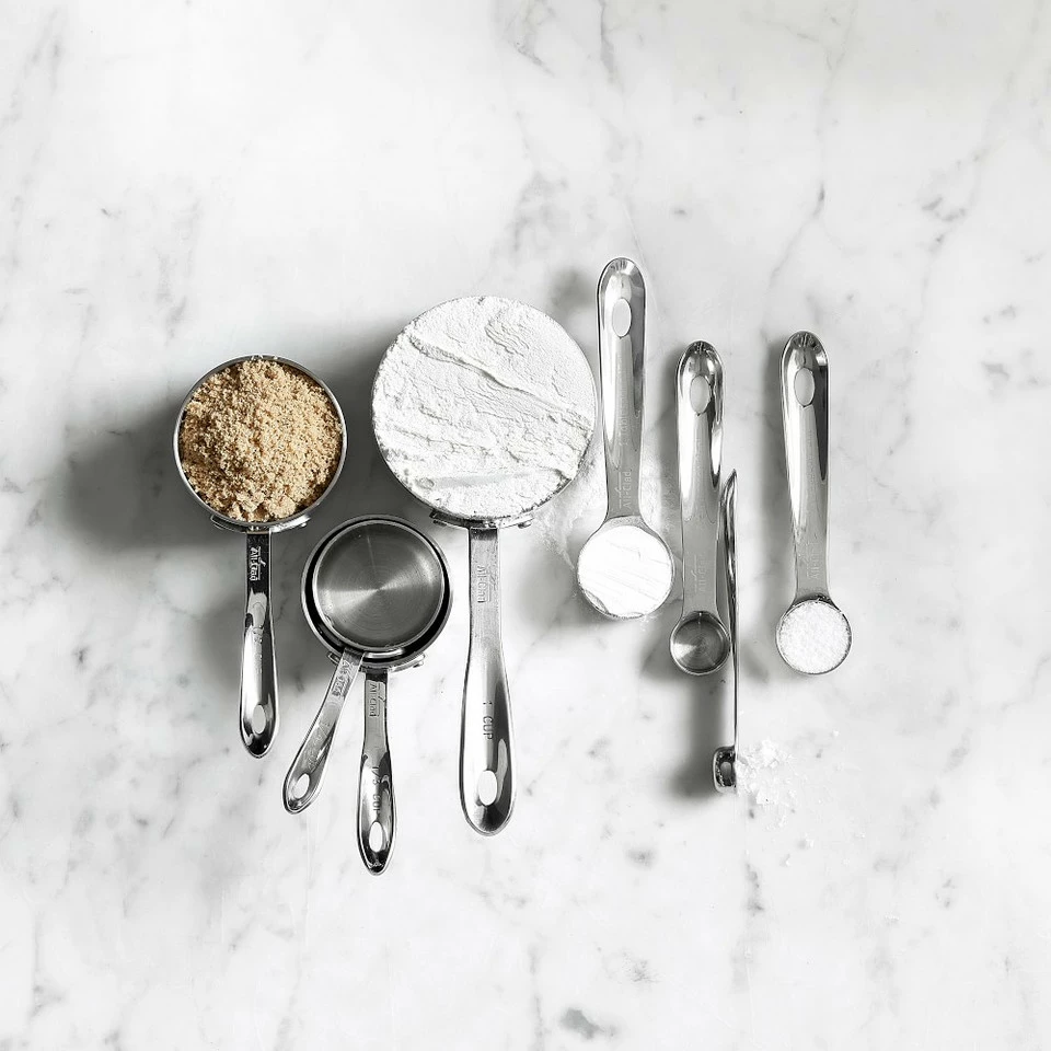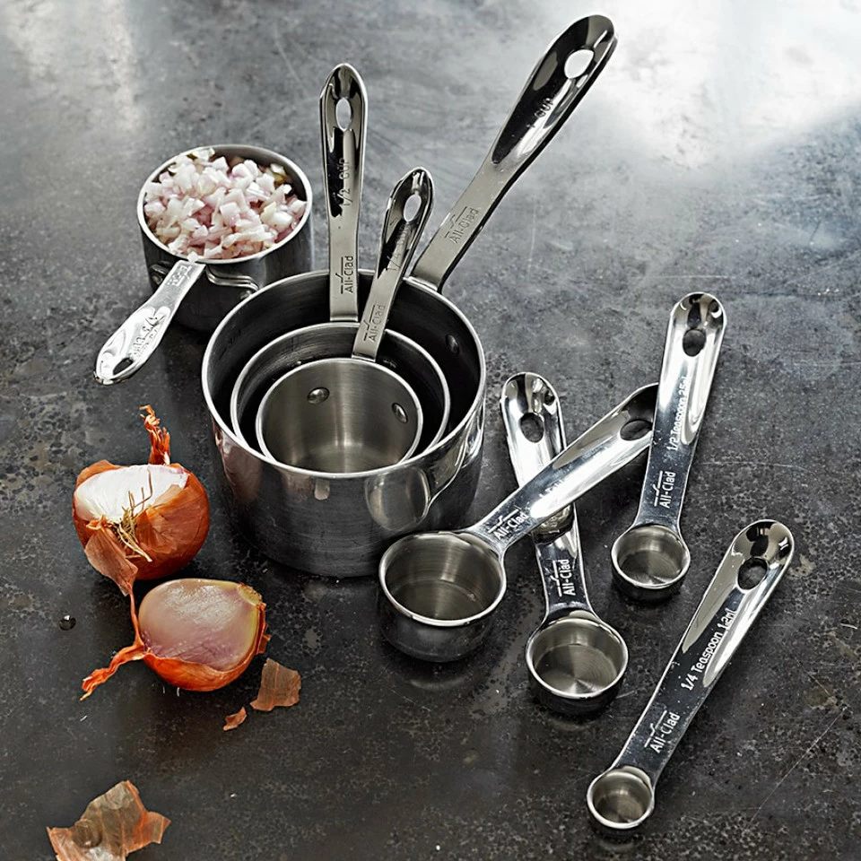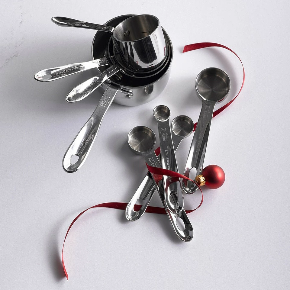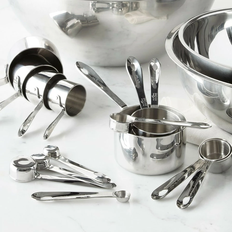 These utensils bring speed and precision to measuring ingredients for baking and cooking. Each is a miniature version of All-Clad’s famous saucepan, made of heavy-gauge stainless steel with a polished finish and the manufacturer’s signature riveted handles.