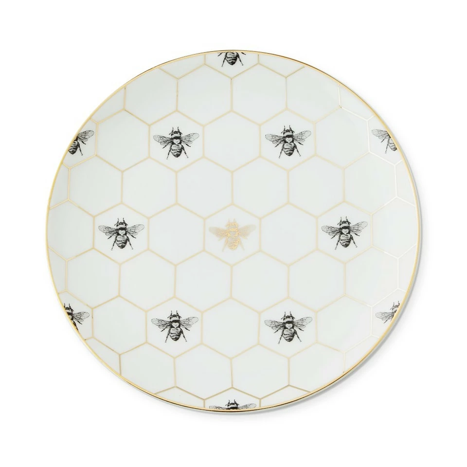 Equal parts elegant and eye-catching, our porcelain appetiser plates showcase a squadron of bees amid graphic, architectural honeycomb. Detailed with 18 carat gold, the collection layers beautifully with white porcelain dinnerware and servingware to create a welcoming table.