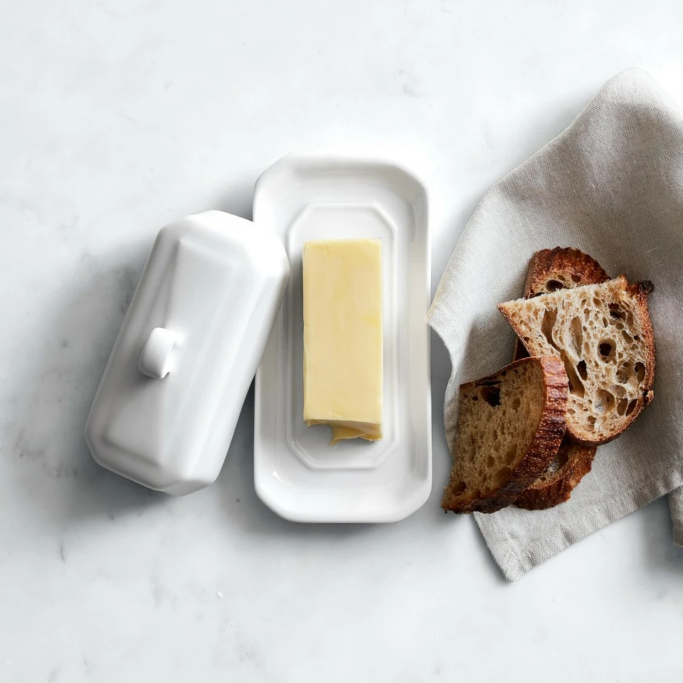 A French classic, this white porcelain butter dish has been a favourite for generations of family meals. As handsome as it is durable, it pairs easily with formal or casual napery, cutlery and glassware, and patterned pieces. Thanks to an innovative formulation of various clays, the porcelain pairs a delicate appearance with superb strength. Made in France by Pillivuyt, a company respected for fine porcelain tableware since 1818. Dishwasher safe. 19 cm x 10 cm x 8 cm high.