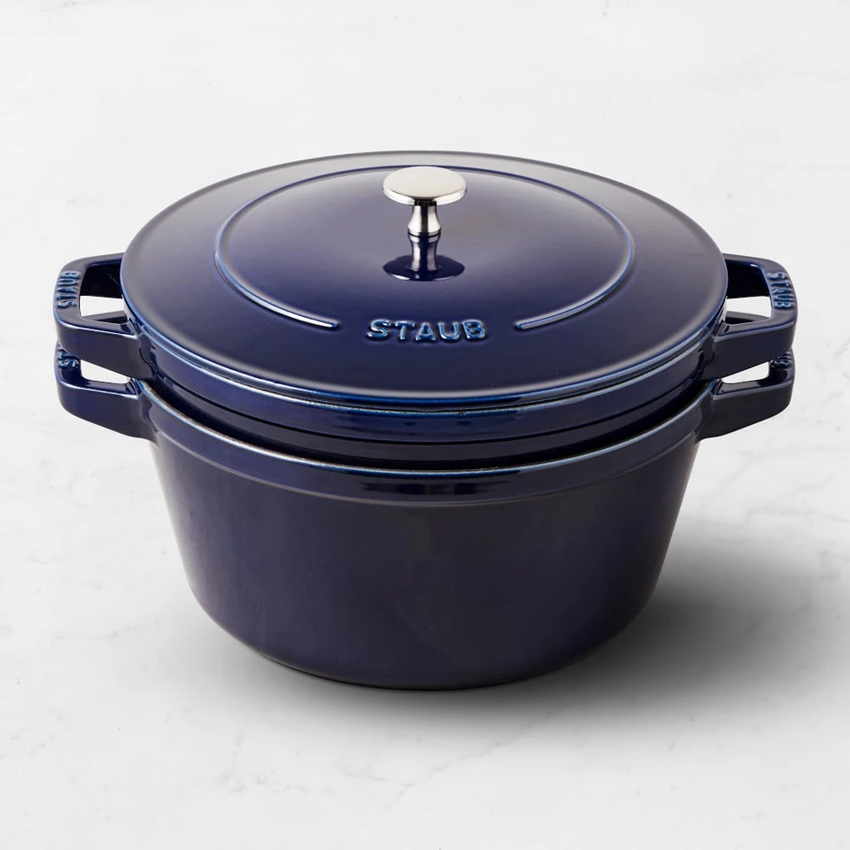 Make an entire meal with this ingenious set from Staub. Featuring two pieces of cast-iron cookware plus a lid that fits them both, it’s designed to stack for space-saving storage. The Dutch oven has tapered sides that are perfect for preparing soups and stews, as well as French classics like coq au vin. The versatile fry pan excels at everything from sautéing chicken to making eggs and frying bacon. The universal lid has interior spikes that funnel juices back down on food for moist, tender results.
