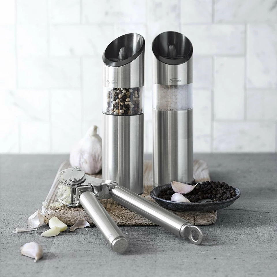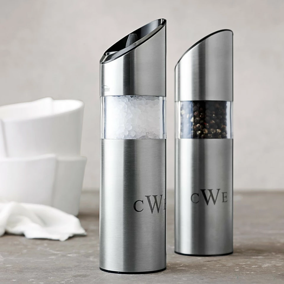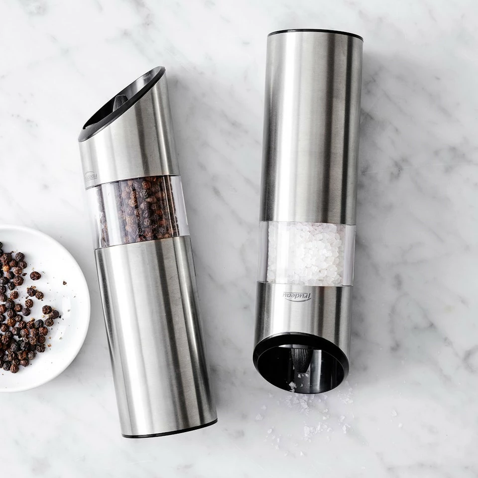 Adding fresh-ground sea salt or pepper to food can be as effortless as a flip of the wrist. Invert these battery-operated mills over food, and their blades begin to whirl. Turn them upright, and the mechanisms shut off.