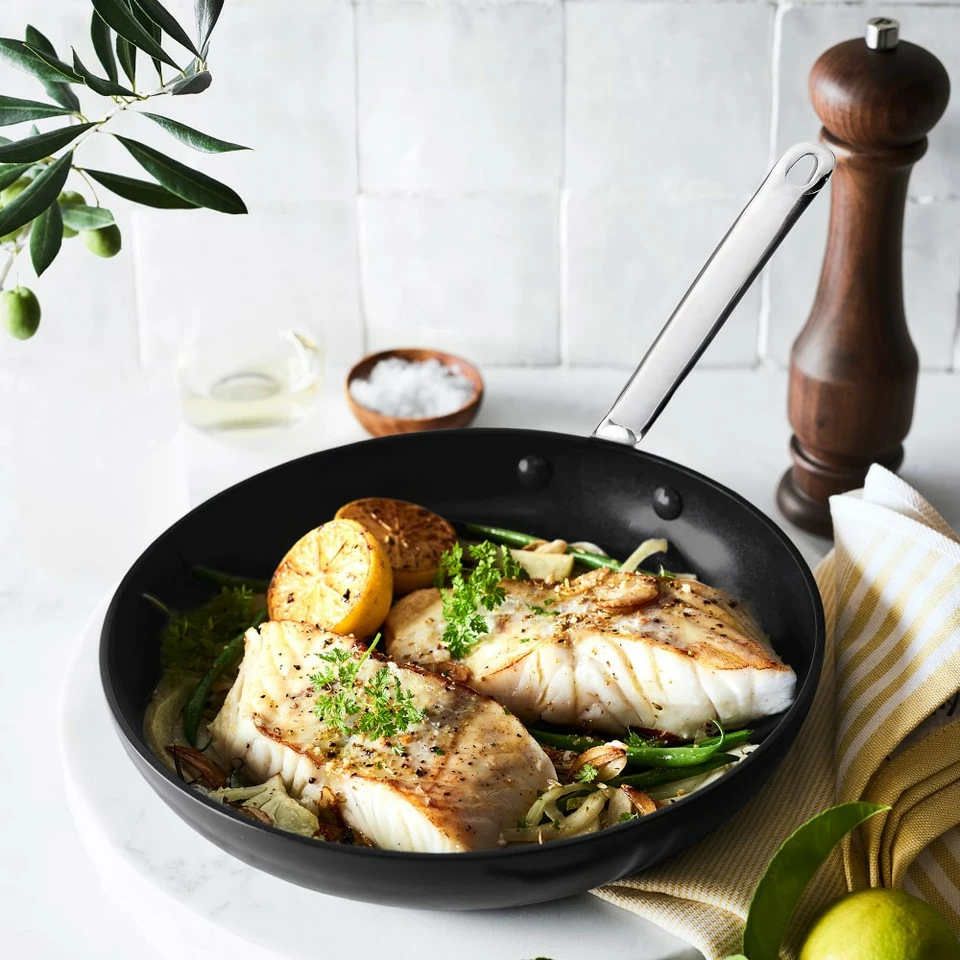 - Hard-anodised aluminium body conducts heat quickly and evenly, with no hot spots.