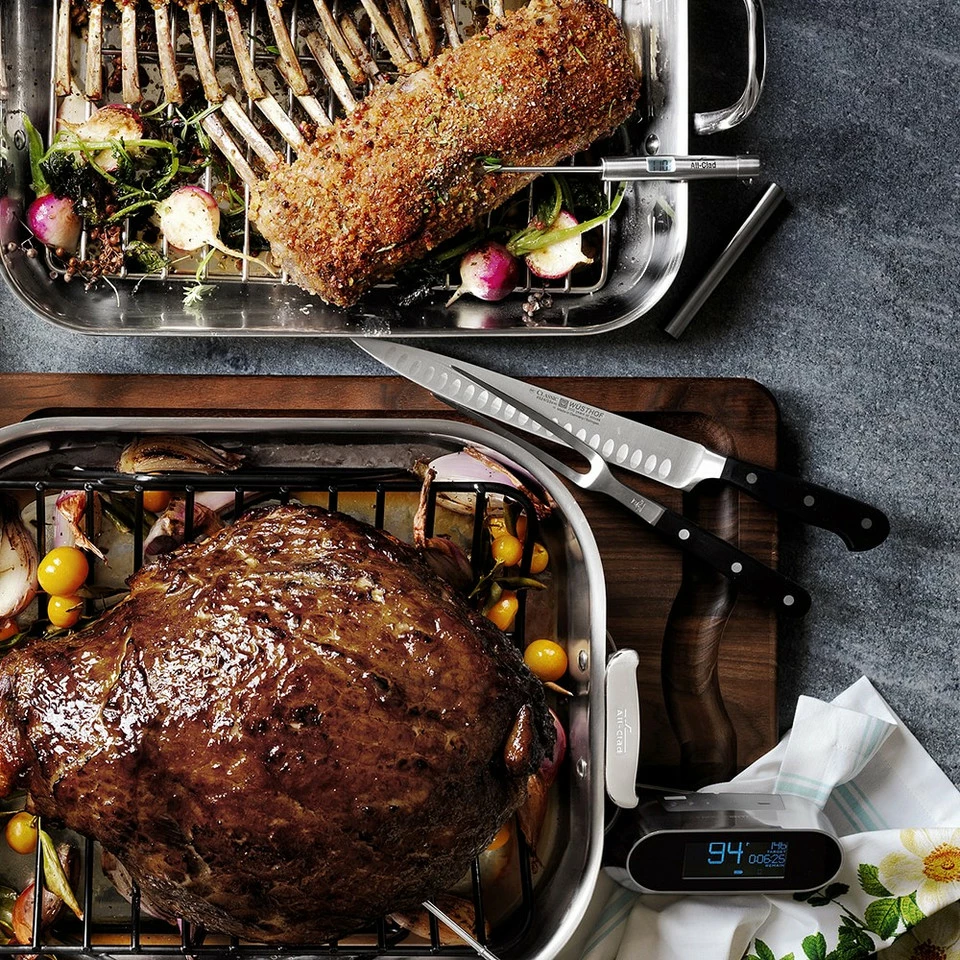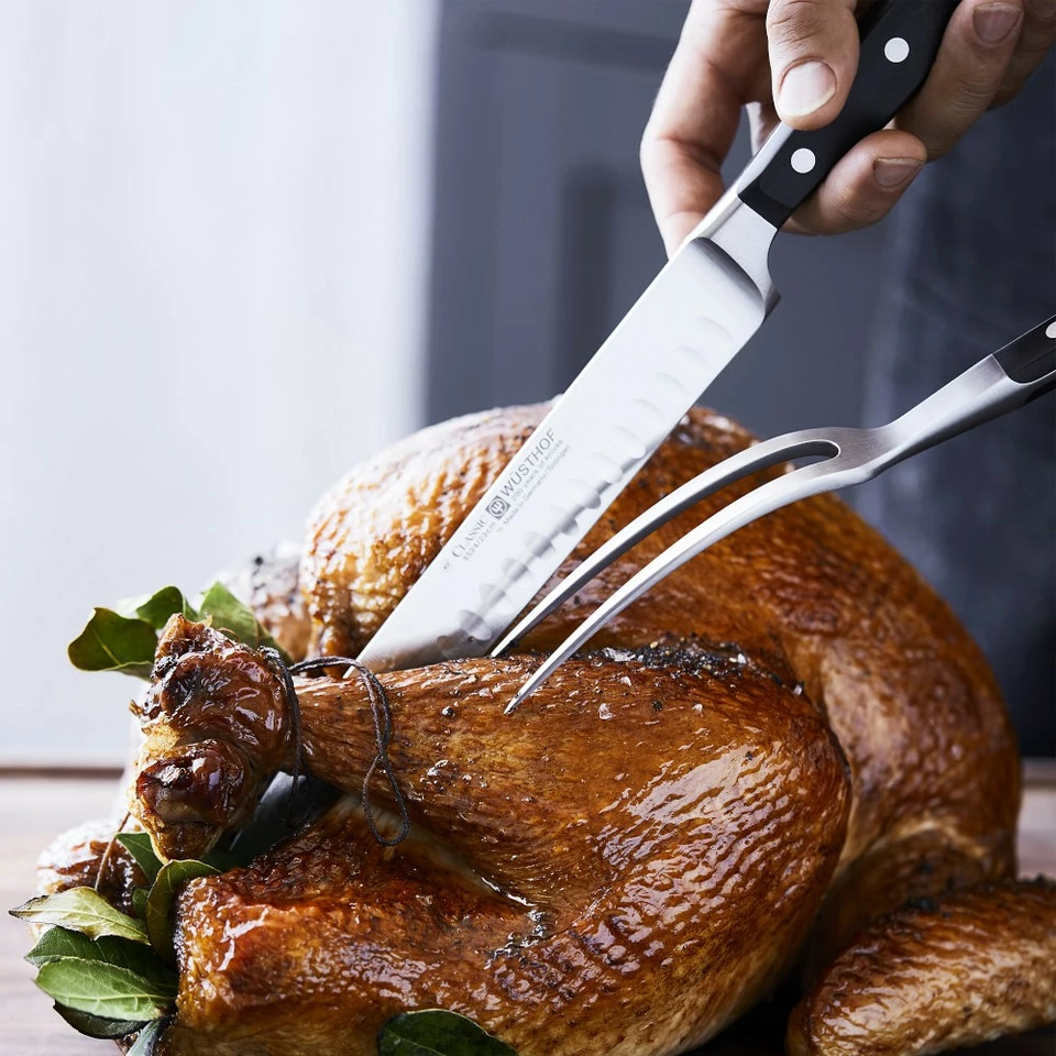 Made in Germany, this set is perfect for carving the holiday bird or any meat or poultry. The knife’s curved high-carbon-steel blade helps you follow the contours of meat on the bone. The sturdy carving fork holds meat securely in place.